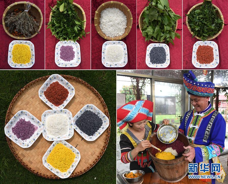 上五圖:4種不同植物及其色素染成的糯米和原色糯米;下左圖:4種不同植物色素染成的糯米和原色糯米;下右圖:在廣西上林縣巷賢鎮(zhèn),兩名壯族村民在查看一桶剛剛蒸熟的五色糯米飯(拼版圖片,3月25日攝)。每年“壯族三月三”到來之際,廣西的壯族同胞都有蒸制五色糯米飯迎接節(jié)日的習(xí)俗,以祈禱五谷豐登,五福臨門。這些五色糯米飯,主要采用天然植物萃取色素,將糯米分別浸泡到紫、黃、紅、黑4種不同植物色素的水里,充分染色后,與原色糯米一起蒸熟而成。色澤鮮艷、清香誘人的五色糯米飯,是“壯族三月三”接待來客時必不可少的傳統(tǒng)美食。新華社記者陸波岸攝