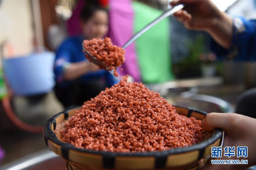 4月16日,在貴州省臺江縣姊妹街哆蝶五彩姊妹飯?bào)w驗(yàn)店,苗家婦女展示制作五彩“姊妹飯”的糯米。新華社發(fā)(劉開福攝)