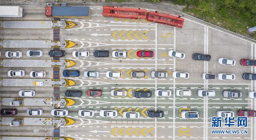 3月24日,在武漢西高速收費站交通卡點,返漢車輛排隊等候入城(無人機照片)。新華社記者才揚攝