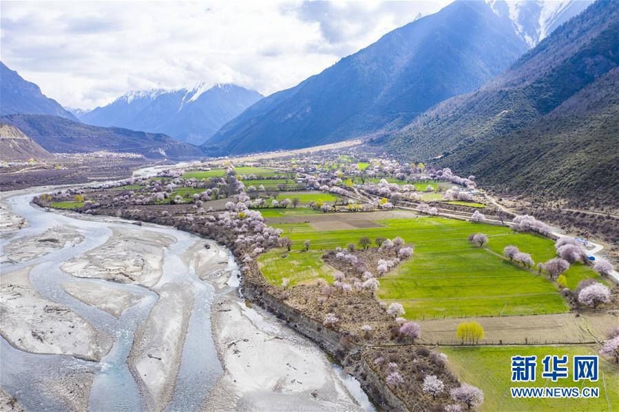 西藏林芝市波密縣境內(nèi)桃花盛開(kāi)的田園風(fēng)光(無(wú)人機(jī)照片,3月26日攝)。新華社記者 普布扎西 攝