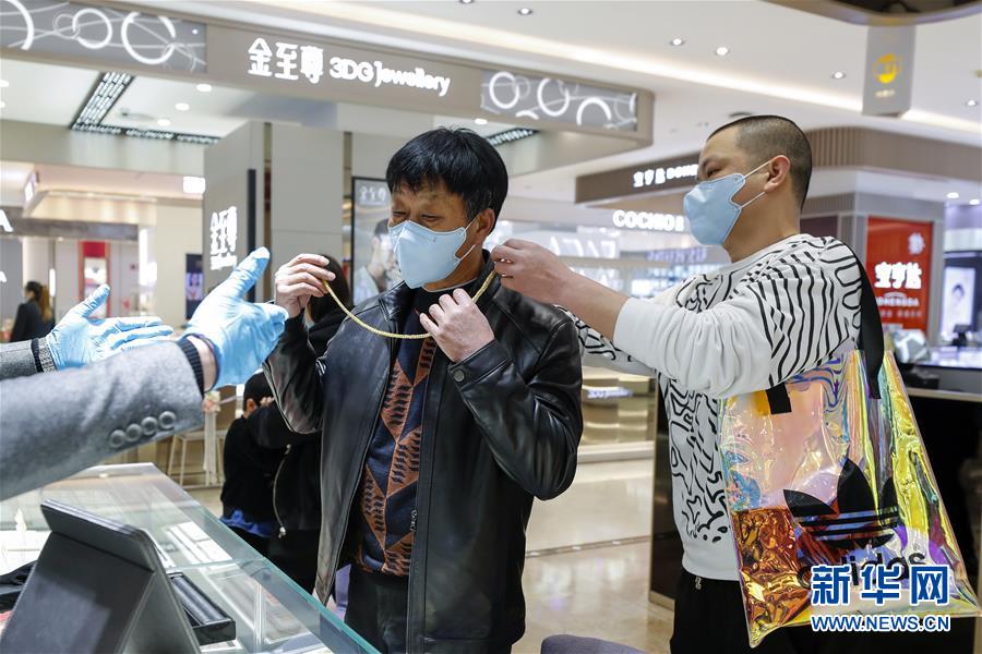 3月30日,在武漢市武商世貿(mào)廣場,顧客(右二)在挑選飾品。當(dāng)日,武漢市多家商場開門迎客。新華社記者沈伯韓攝