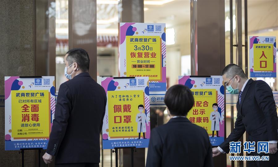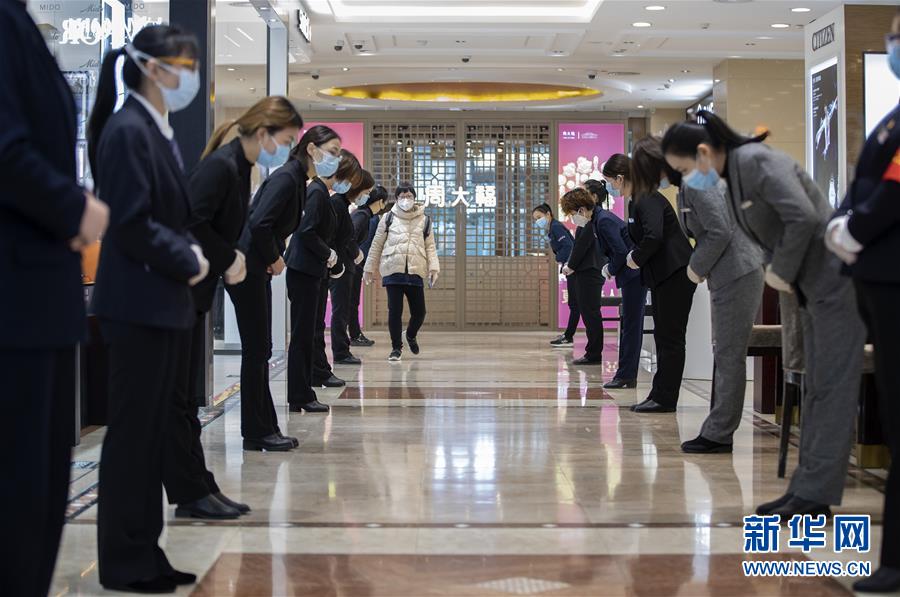 3月30日,在武商世貿(mào)廣場,工作人員歡迎顧客進(jìn)入。當(dāng)日,武漢市多家商場開門迎客。新華社記者費(fèi)茂華攝