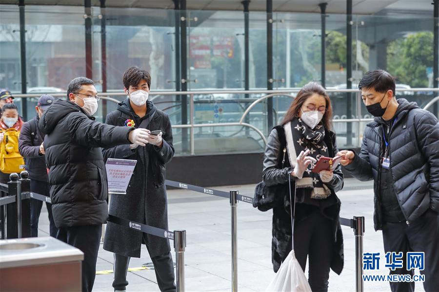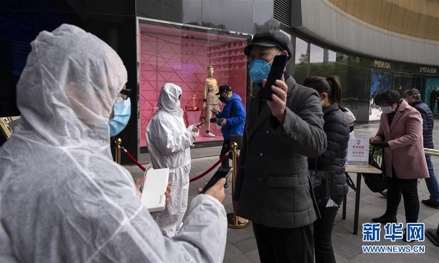 3月30日,在武漢市武商廣場外,人們?cè)诠ぷ魅藛T指引下,用手機(jī)掃描健康碼后進(jìn)入商場購物。當(dāng)日,武漢市多家商場開門迎客。新華社記者沈伯韓攝