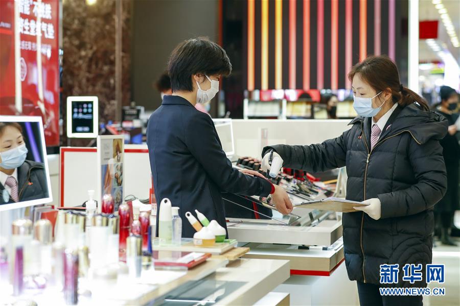 3月30日,在武漢市武商廣場,一名管理人員(右)在測量銷售人員的體溫。據(jù)了解,商場每兩小時(shí)就會(huì)測量一次所有銷售人員的體溫。當(dāng)日,武漢市多家商場開門迎客。新華社記者沈伯韓攝