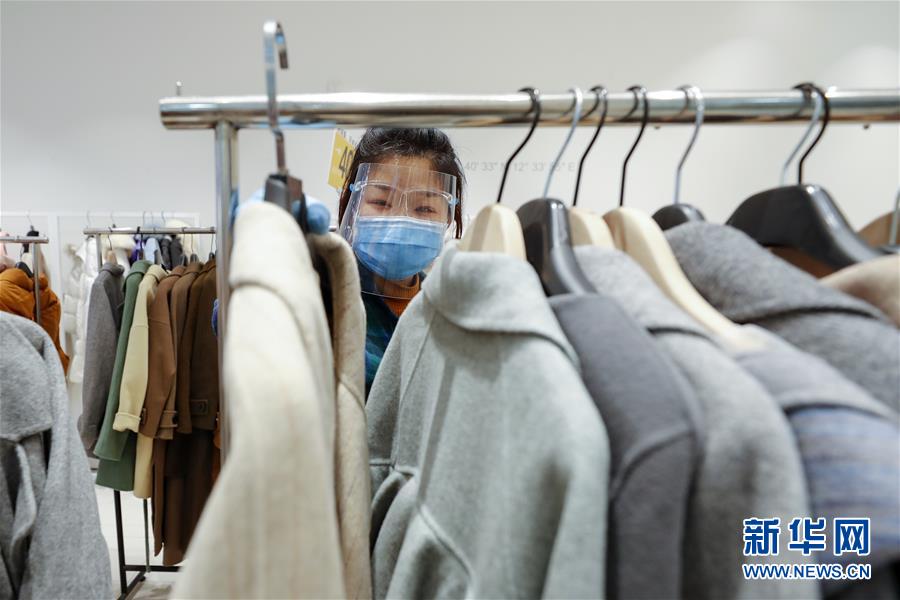 3月30日,在武漢市武商世貿(mào)廣場,銷售員在整理貨架上的衣服。當(dāng)日,武漢市多家商場開門迎客。新華社記者沈伯韓攝