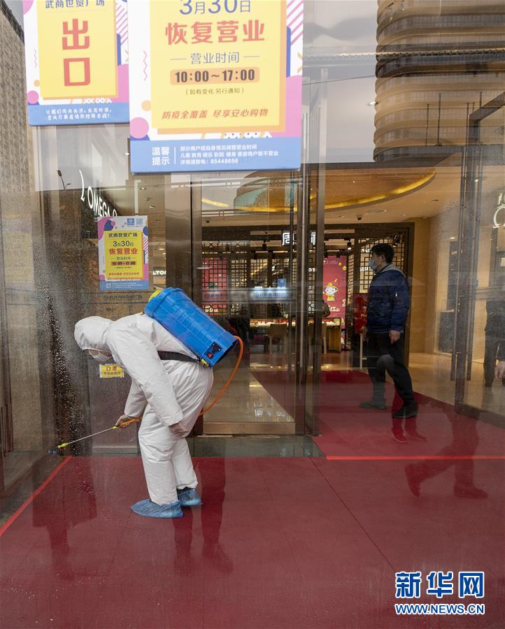 3月30日,在武商世貿(mào)廣場(chǎng),工作人員在開門前進(jìn)行最后的消殺工作。當(dāng)日,武漢市多家商場(chǎng)開門迎客。新華社記者費(fèi)茂華攝