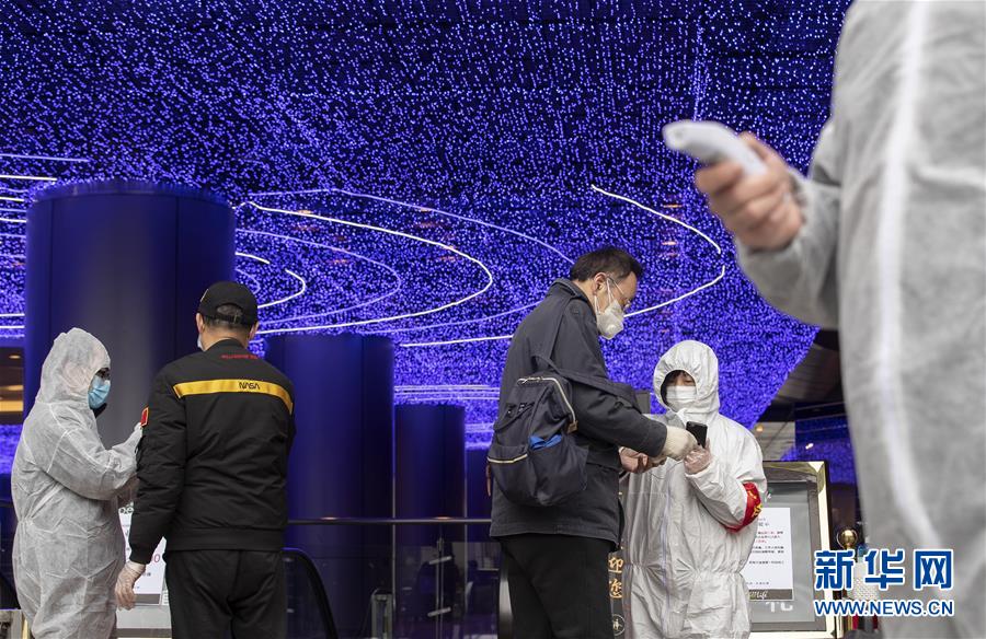 3月30日,在武商國際廣場的超市前,工作人員測量顧客的體溫、查看健康碼。當(dāng)日,武漢市多家商場開門迎客。新華社記者費(fèi)茂華攝