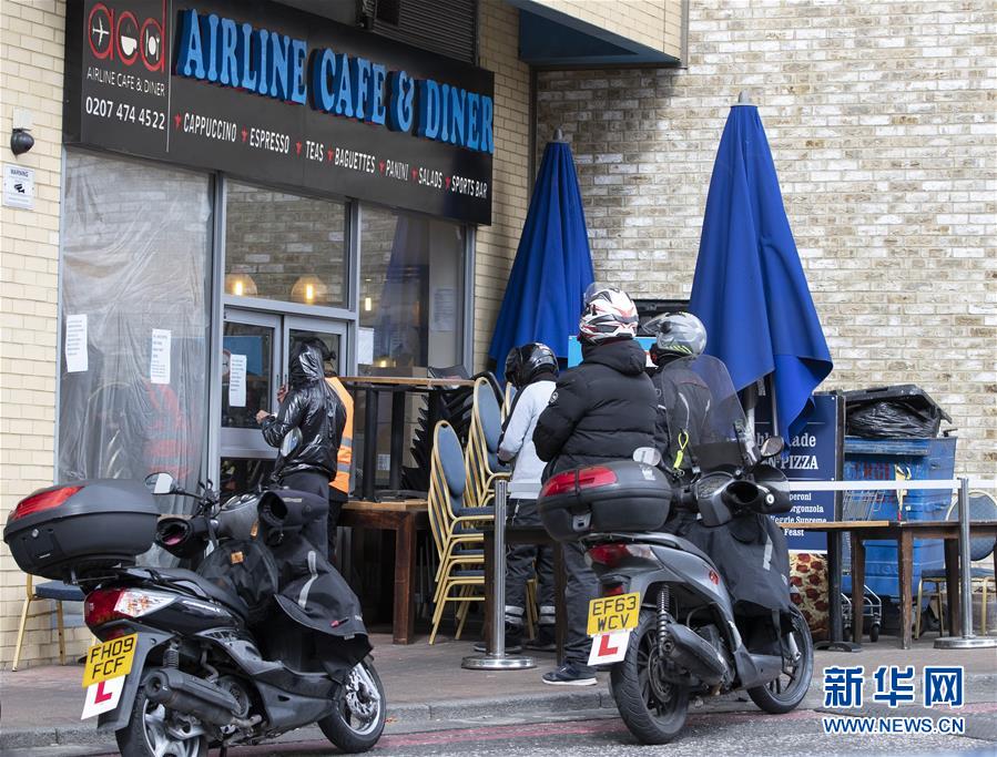 3月30日,在英國倫敦,幾名外賣送餐騎手在一家餐廳外等待取餐。英國衛(wèi)生部30日發(fā)布的數(shù)據(jù)顯示,英國新冠肺炎確診病例累計22141例,較前一天增加2619例;累計死亡病例增至1408例。新華社記者韓巖攝