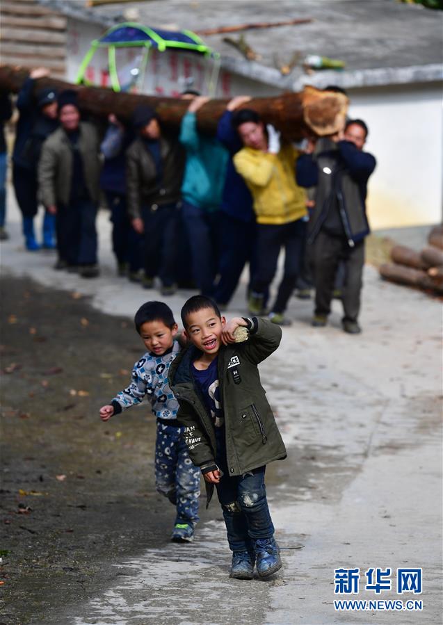 烏英苗寨的小朋友幫大人抬小木頭,準(zhǔn)備用于制作蘆笙柱(12月2日攝)。新華社記者黃孝邦攝