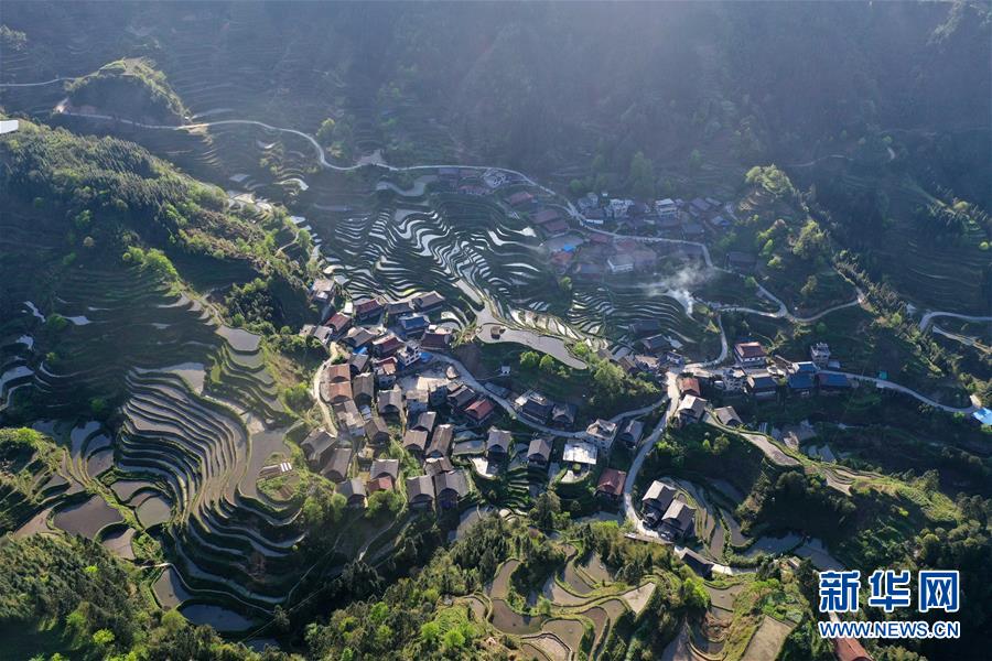 這是融水苗族自治縣桿洞鄉(xiāng)小河村高羽苗寨的木樓和梯田(3月31日攝,無人機照片)。新華社記者黃孝邦攝