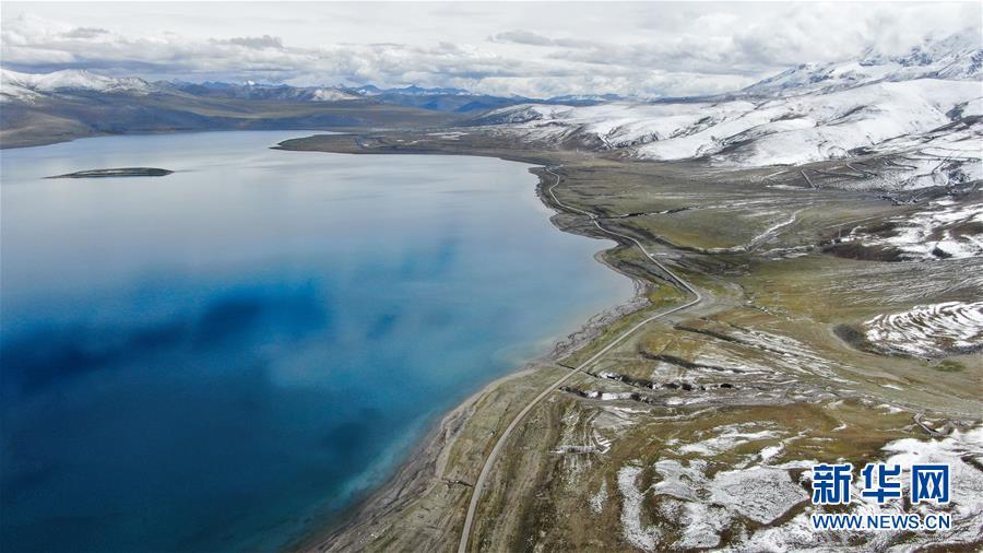 8月31日無人機拍攝的羊卓雍錯及邊上的307省道。新華社記者晉美多吉攝