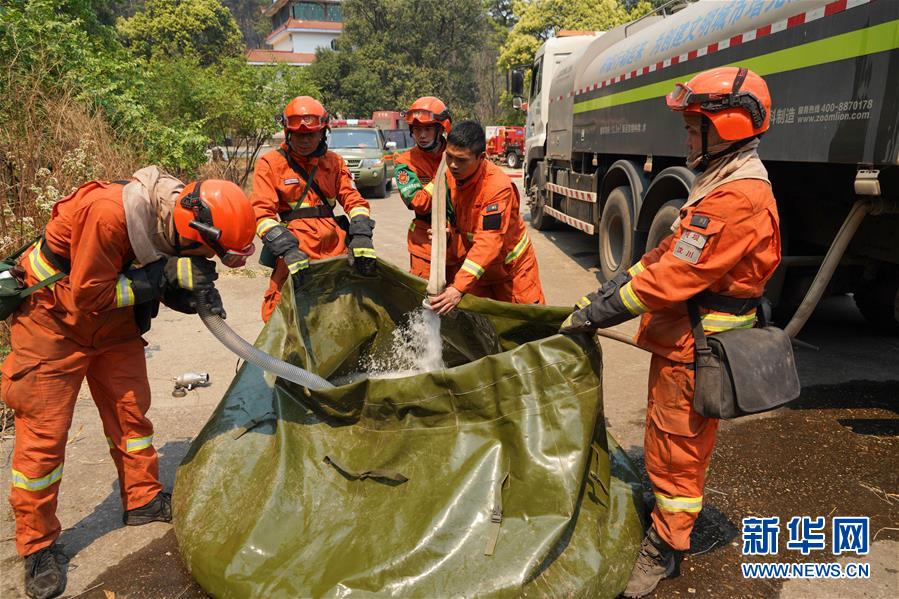 4月1日,在西昌市邛海瀘山景區(qū)臥云山莊旁,消防隊(duì)員在儲水。新華社記者胥冰潔攝
