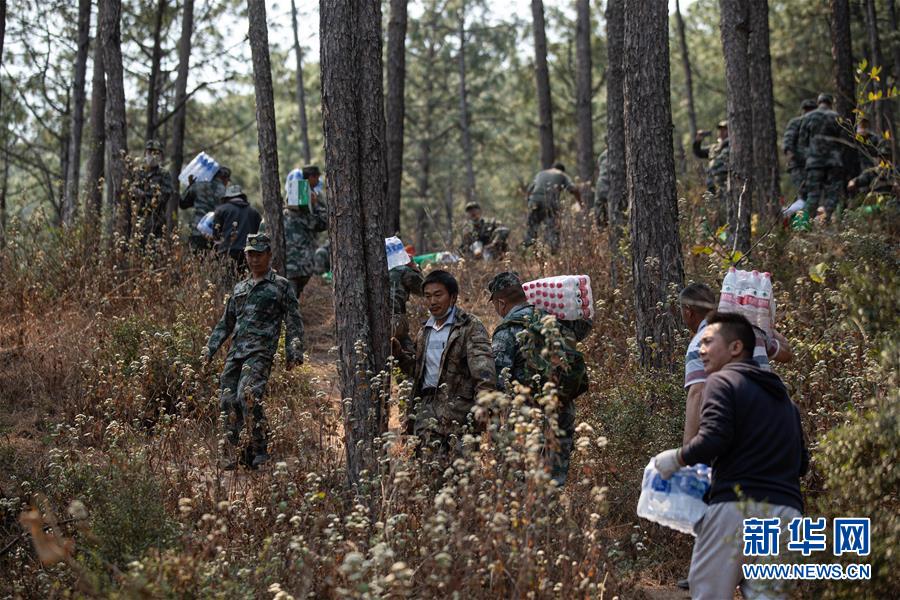 4月1日,西昌市當(dāng)?shù)氐母刹咳罕娤蚧饒鲞\(yùn)送礦泉水,為撲火隊(duì)員提供生活物資保障。新華社記者江宏景攝