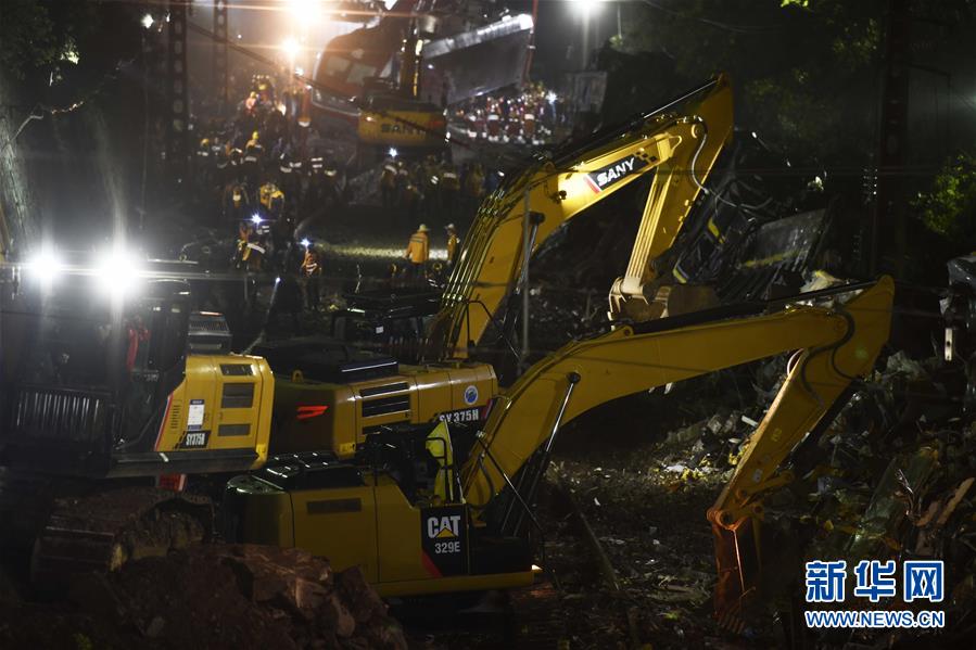 3月30日晚,工程機(jī)械在京廣鐵路郴州段脫軌事故現(xiàn)場作業(yè)。新華社記者李尕?cái)z