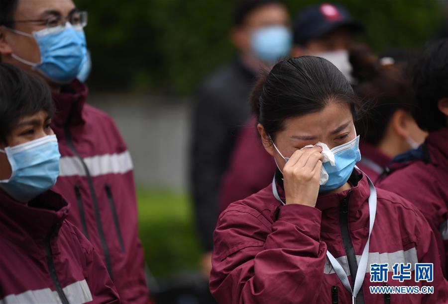 4月3日,來(lái)自西安交通大學(xué)第一附屬醫(yī)院的醫(yī)療隊(duì)隊(duì)員王沙沙(前)在送別“戰(zhàn)友”后落淚。 當(dāng)日,陜西省第一批援鄂醫(yī)療隊(duì)137名隊(duì)員在陜西省工人療養(yǎng)院結(jié)束了為期兩周的隔離休養(yǎng)。醫(yī)療隊(duì)員與“戰(zhàn)友”深情作別后,陸續(xù)踏上歸途。 新華社記者 李一博 攝