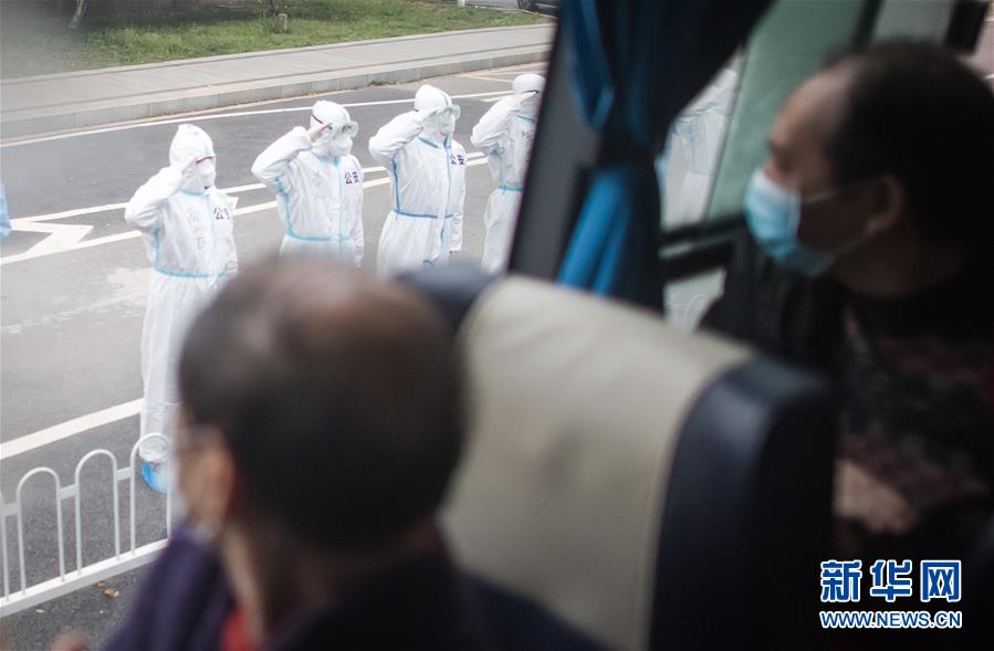 3月12日,在湖北武漢,公安民警向踏上回家路的治愈患者敬禮。 新華社記者 肖藝九 攝