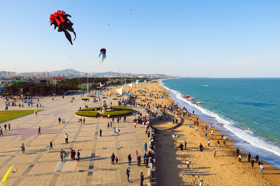 2020年4月5日,在山東日照萬平口景區(qū),游客放飛五彩斑斕的風箏。
