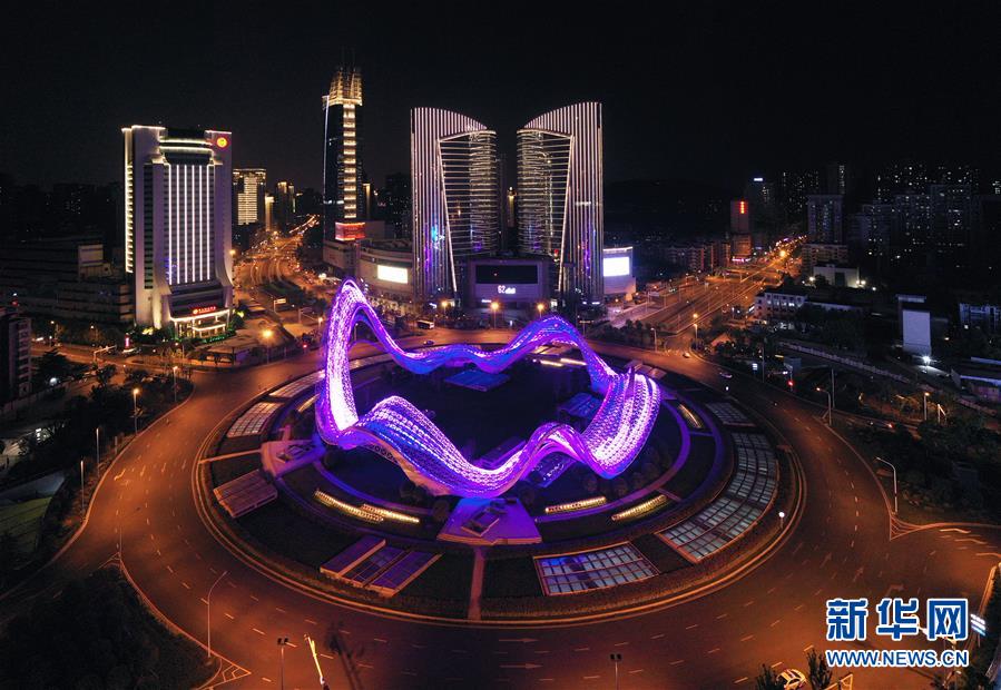 4月7日,武漢光谷環(huán)島開啟燈光秀(無人機(jī)照片)。當(dāng)日,隨著武漢解除離漢通道管控進(jìn)入倒計(jì)時(shí),全市開啟了城市景觀照明,夜色中的武漢美不勝收。新華社記者李賀攝