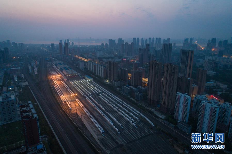 4月8日,在武漢動(dòng)車段,列車??吭诖孳嚲€上準(zhǔn)備投入運(yùn)行(無(wú)人機(jī)照片)。 新華社記者 肖藝九 攝