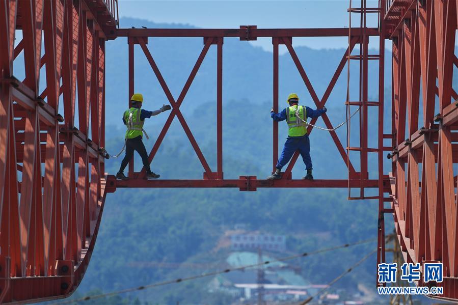 中老鐵路施工忙在位于普洱市的木乃河雙線特大橋工程現(xiàn)場(chǎng),工人鐘琪(左)和馮壯在進(jìn)行架橋機(jī)前橫聯(lián)螺絲檢查及二次緊固(4月12日攝)。新華社記者秦晴攝
