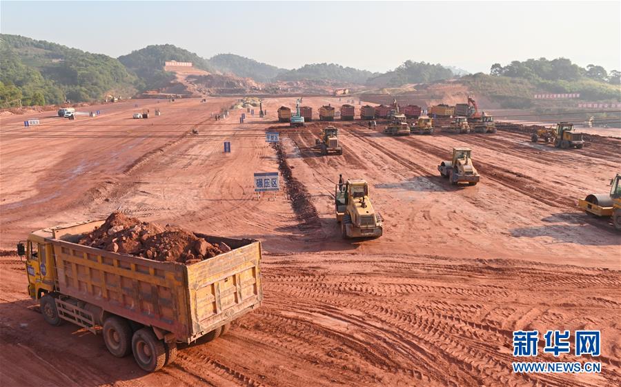 普洱車站施工現(xiàn)場正在進行路基土方填筑施工(4月12日攝)。新華社記者秦晴攝