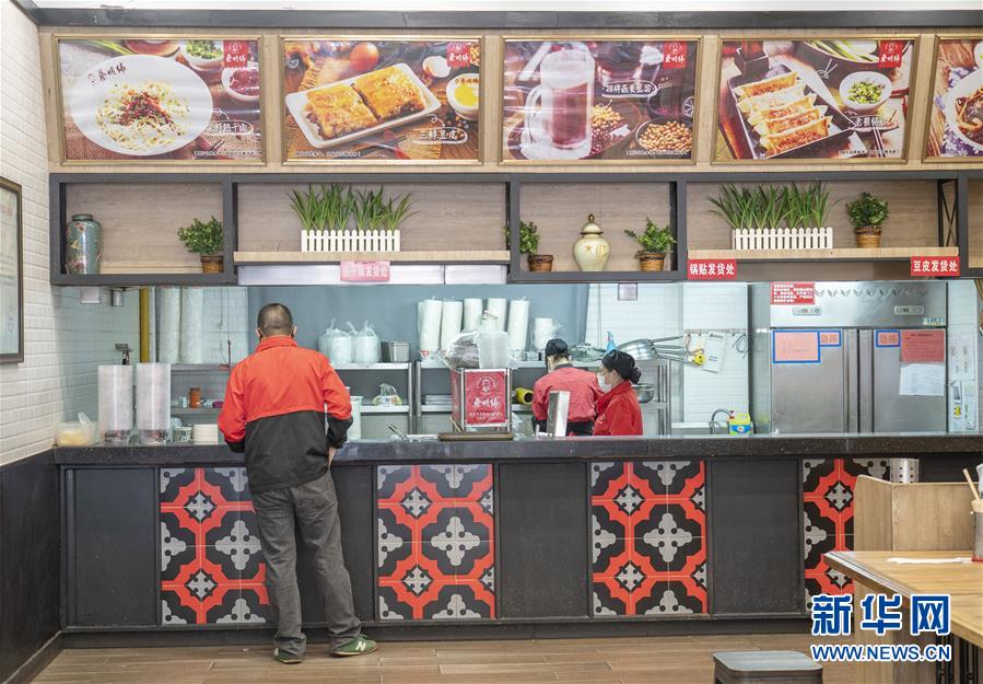 4月8日,在武漢市洪山區(qū)智和路附近的一家熱干面館,工作人員在制作熱干面。新華社記者才揚攝