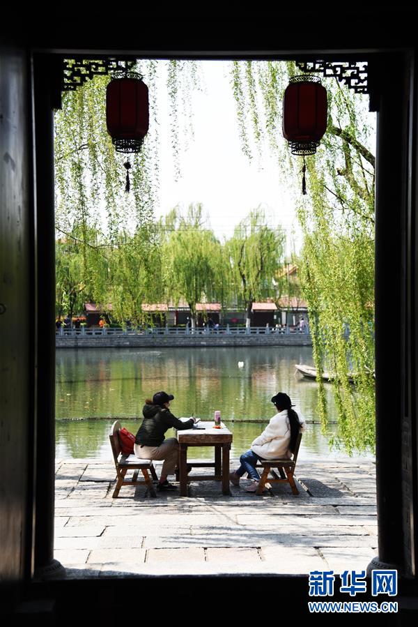 4月13日,游客在濟(jì)南百花洲歷史文化街區(qū)沿街座位上作畫。新華社記者王凱攝