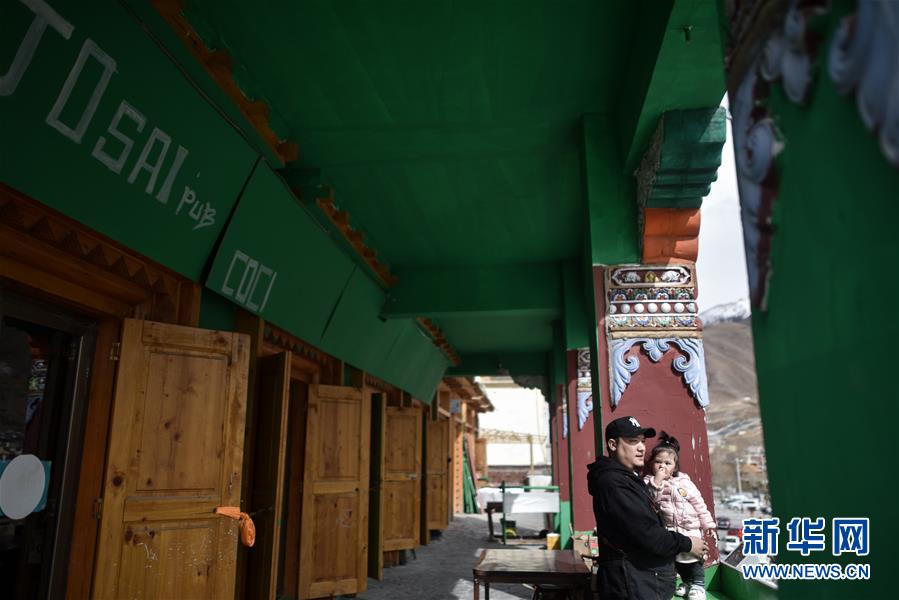 4月10日,才仁俄賽和女兒在餐廳門口遠(yuǎn)眺玉樹街景。新華社記者吳剛攝