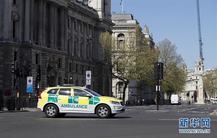 4月14日,在英國(guó)倫敦,一輛救護(hù)車從議會(huì)街前駛過(guò)。新華社記者韓巖攝