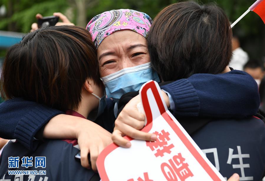 4月21日,在四川大學華西醫(yī)院,醫(yī)療隊隊員和同事相互擁抱。當日,來自四川大學華西醫(yī)院、華西第二醫(yī)院、華西第四醫(yī)院的醫(yī)療隊隊員解除隔離休整,與分別許久的家人、同事團聚,緊緊相擁。新華社記者王曦攝