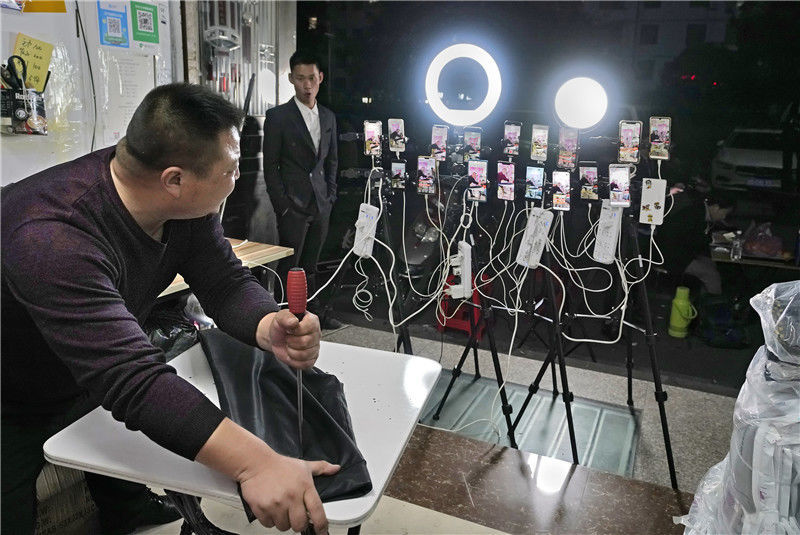 2019年11月11日,浙江金華,義烏北下朱村,一名男子在直播。一名女子在購物。