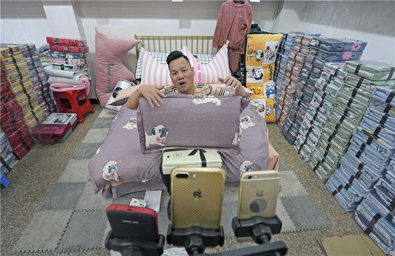 2019年11月10日,江金華,義烏北下朱村,在店鋪里直播銷售床上用品的兩個(gè)店員。