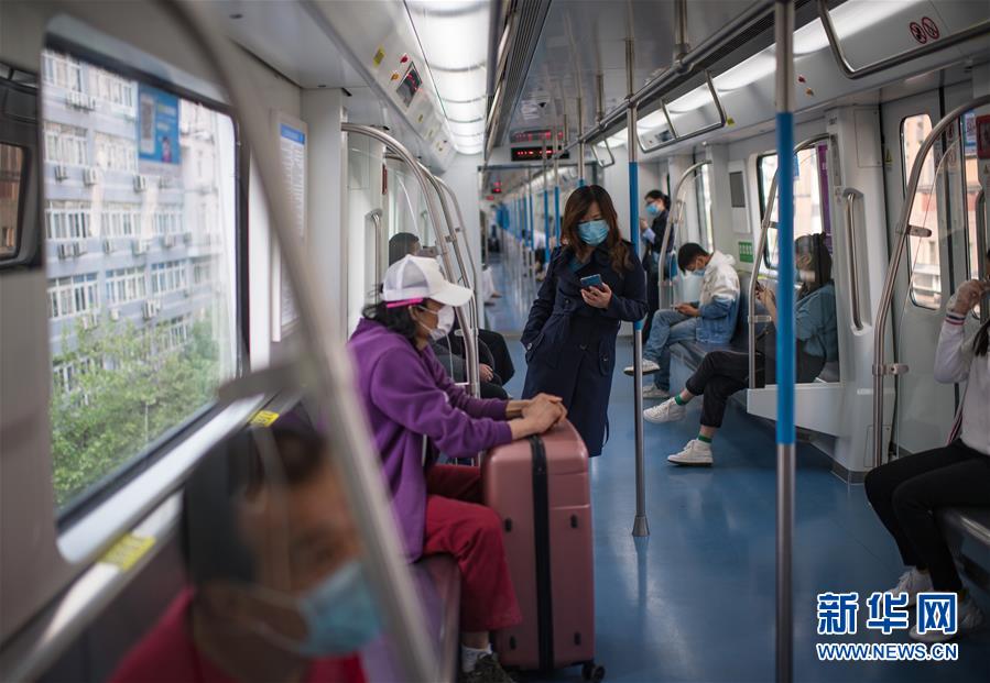 4月16日,武漢市民保持距離乘坐軌道交通一號線列車。新華社記者肖藝九攝