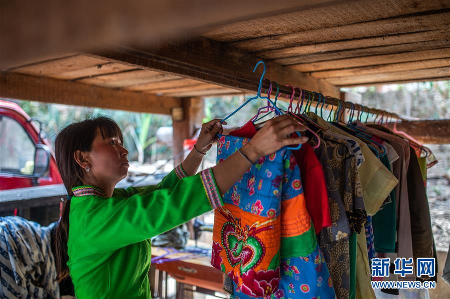 4月12日,在云南省勐??h布朗山鄉(xiāng)曼囡村曼班三隊,娜四在家晾曬衣服。新華社記者胡超攝