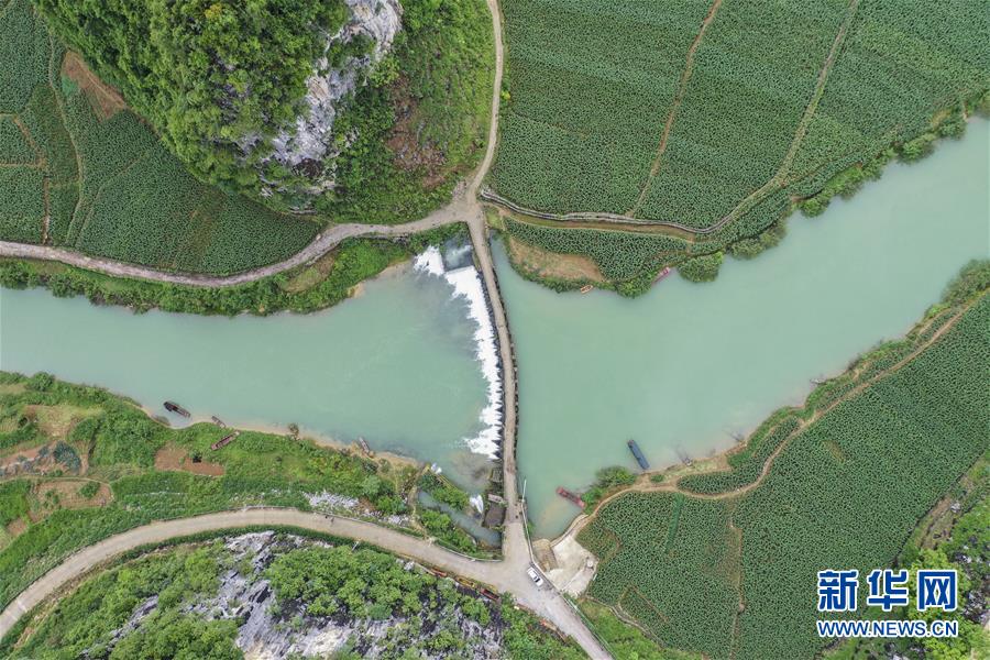 4月23日,在廣西隆安縣南圩鎮(zhèn),農(nóng)人趕著牲畜走過一座小橋(無人機(jī)照片)。新華社記者周華攝