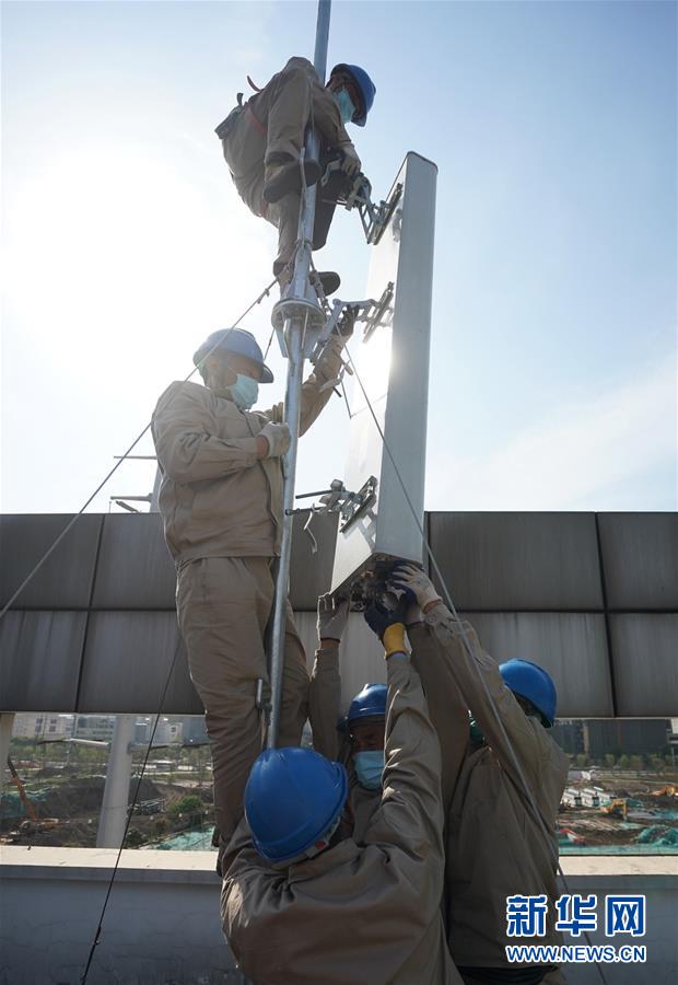 4月25日,在南京220千伏城南河變電站屋頂,工人在架設(shè)5G設(shè)備。當(dāng)日,三大通信運營商的2座5G、3座4G基站建設(shè)工作在南京220千伏城南河變電站屋頂有序展開。在變電站內(nèi)建設(shè)基站可有效利用電網(wǎng)資源,縮短建設(shè)周期,節(jié)約建設(shè)成本。新華社記者季春鵬攝