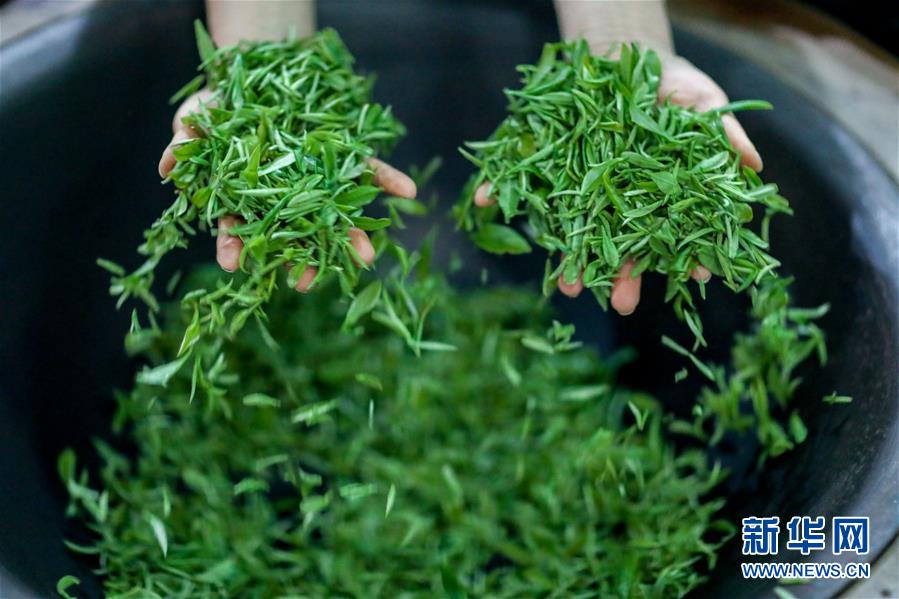 4月25日,工作人員在“扶貧茶園”內(nèi)制作綠茶。谷雨過后,在貴州省黔東南苗族侗族自治州丹寨縣“扶貧茶園”,茶農(nóng)搶抓農(nóng)時趕制春茶。丹寨縣創(chuàng)新產(chǎn)業(yè)扶貧模式,鼓勵社會公眾線上認(rèn)領(lǐng)茶園,再由茶園聘請當(dāng)?shù)刎毨魟?wù)工,為貧困戶創(chuàng)造茶園管理、采茶、制茶等就業(yè)機會,幫助貧困戶增收。今年以來,“扶貧茶園”已接受線上預(yù)訂600余畝,給當(dāng)?shù)?00余名村民提供了就業(yè)機會。新華社記者歐東衢攝