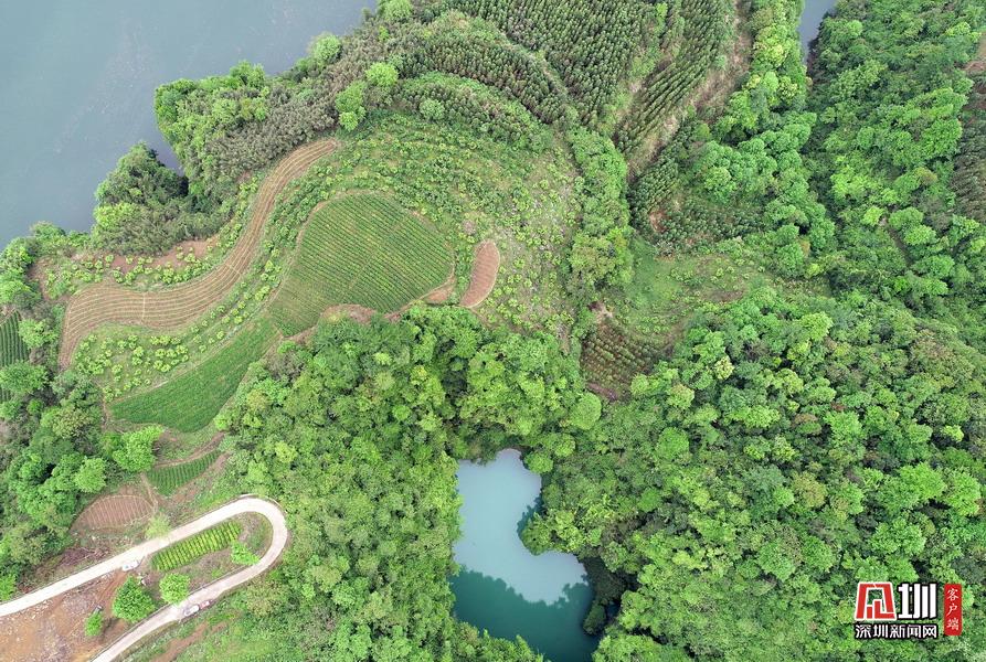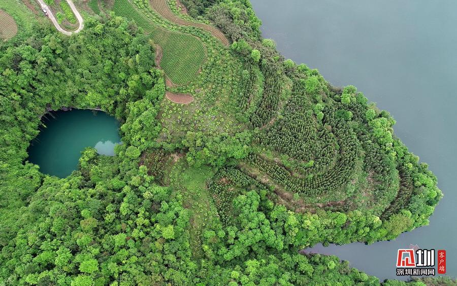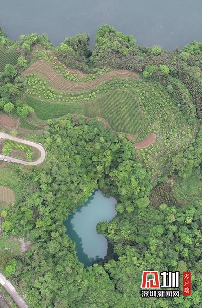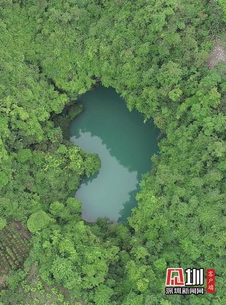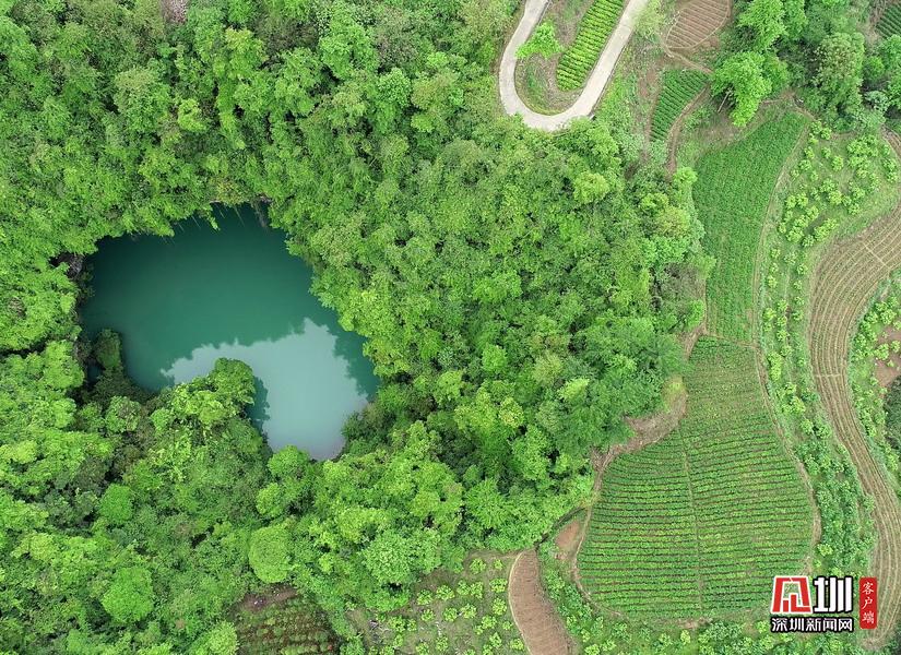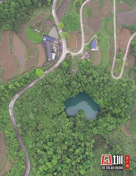 2020年4月24日,在湖南張家界市永定區(qū)“百里畫廊”茅巖河景區(qū)拍攝的“天坑心湖”。(無(wú)人機(jī)拍攝)