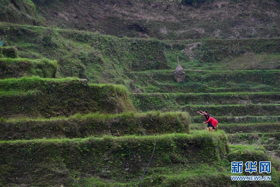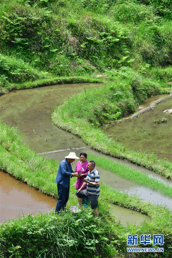 3月25日,在桂黔烏英苗寨,村民將螺苗搬往田間,準(zhǔn)備投放。新華社記者黃孝邦攝