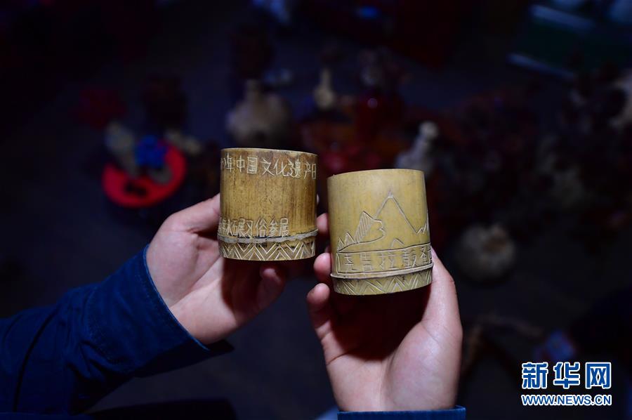 李義成(右)在村民家里了解手工藝品的制作情況(4月26日攝)。新華社記者黃孝邦攝