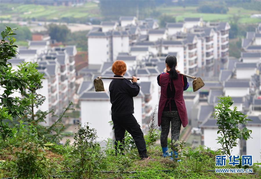 在廣西融水苗族自治縣縣城一處易地扶貧搬遷小區(qū)附近,45歲的楊美燕(左)和搬遷戶楊鮮花在農(nóng)場里護(hù)理果樹(3月13日攝)。