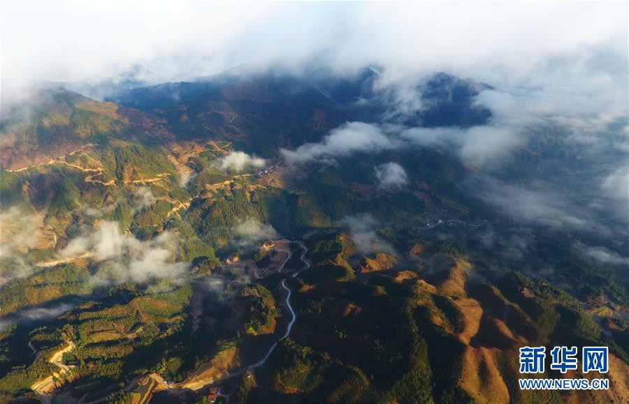 這是云霧繚繞的堯告村(無人機照片,2019年1月18日攝)。新華社記者黃孝邦攝