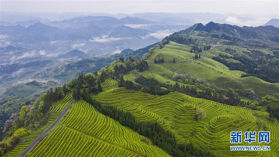 俯瞰鹿鳴茶海一角(4月28日無(wú)人機(jī)照片)。四川省珙縣的鹿鳴茶海,常年云霧繚繞,茶壟依山分布,美不勝收。新華社記者江宏景攝