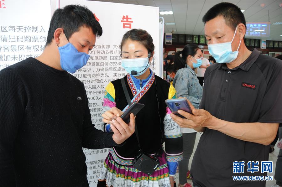 4月30日,織金洞景區(qū)工作人員(中)在給游客講解線上購票方法?!拔逡弧毙¢L假將至,位于貴州省織金縣的世界地質(zhì)公園織金洞景區(qū)迎來各地游客。據(jù)了解,該景區(qū)實(shí)行分時(shí)段預(yù)約和人數(shù)限流措施,確保游客安全有序游覽。新華社記者 李黔渝 攝