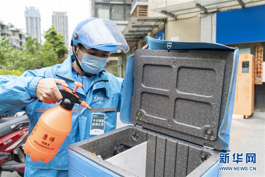 4月22日,在四川省成都市的一家外賣配送站點,邱有哈子在給餐箱消毒。新華社記者 李夢馨 攝