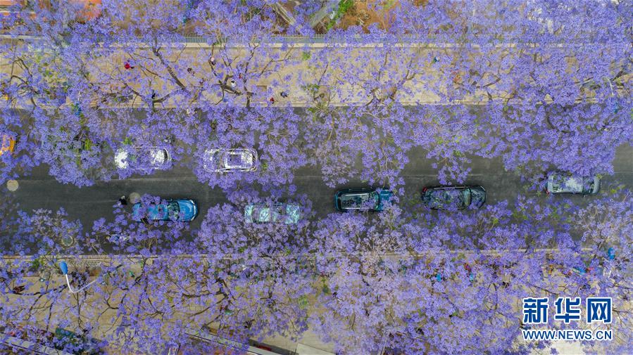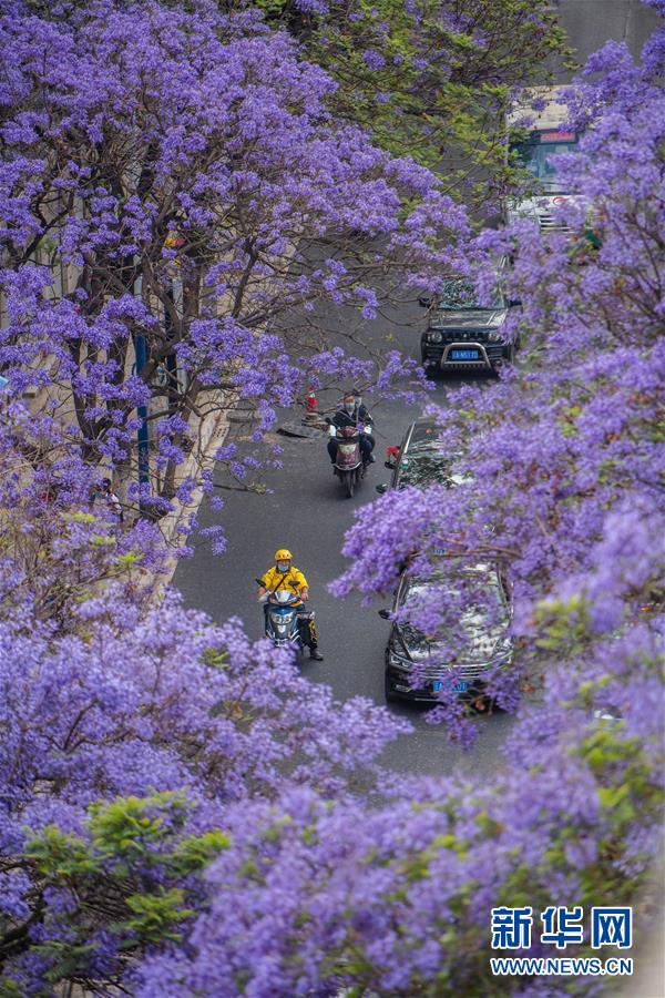 這是5月2日在昆明市桃源街拍攝的藍(lán)花楹。近日,云南省昆明市部分街區(qū)的藍(lán)花楹競相開放,為春城增添靚麗風(fēng)景。新華社記者藺以光攝