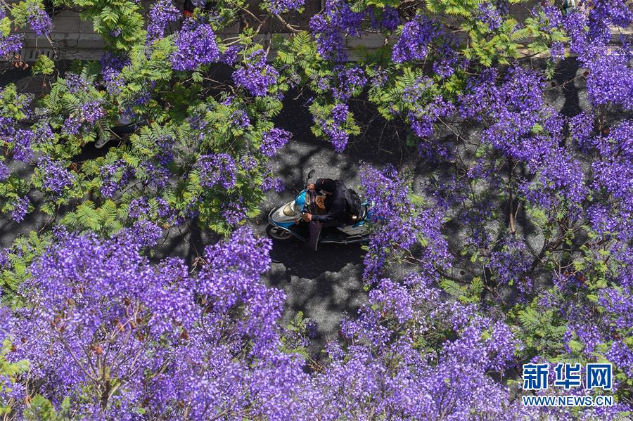 這是5月2日在昆明市教場中路拍攝的藍(lán)花楹。近日,云南省昆明市部分街區(qū)的藍(lán)花楹競相開放,為春城增添靚麗風(fēng)景。新華社記者藺以光攝