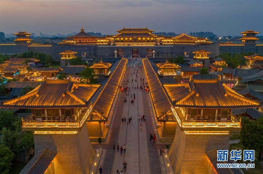 5月1日,游客在湖北省襄陽市唐城景區(qū)觀賞夜景(無人機照片)。“五一”假日期間,人們以多種方式放松心情、享受假日。新華社發(fā)(楊東攝)