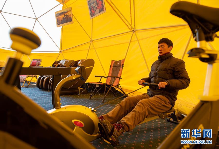 登山隊員在珠峰大本營內(nèi)健身(5月1日攝)。新華社記者晉美多吉攝