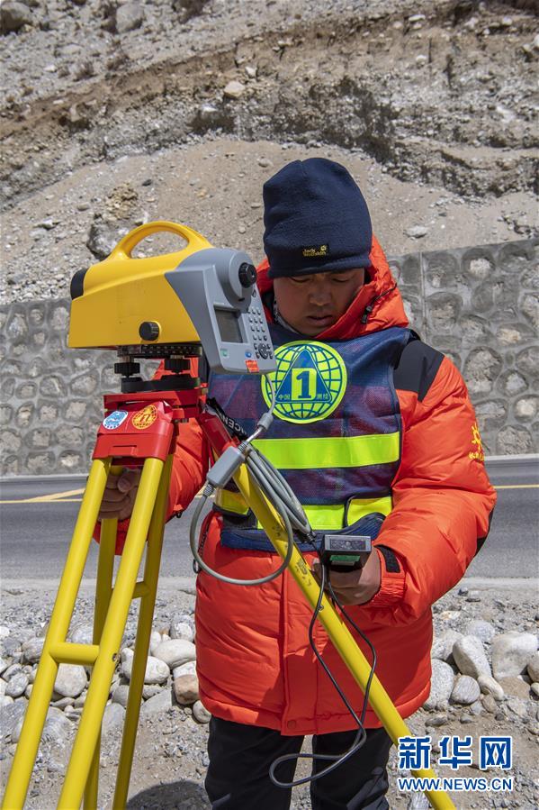 國測一大隊隊員金良在操作水準儀(4月18日攝)。水準測量是一種利用提供水平視線的儀器(如水準儀、水準標尺),測定地面不同點之間的高差,并以此推算高度的一種方法,是經(jīng)典大地測量的重要技術(shù)之一。在目前正在進行的2020珠峰高程測量中,部分國測一大隊隊員承擔了水準測量的任務(wù)。新華社記者晉美多吉攝